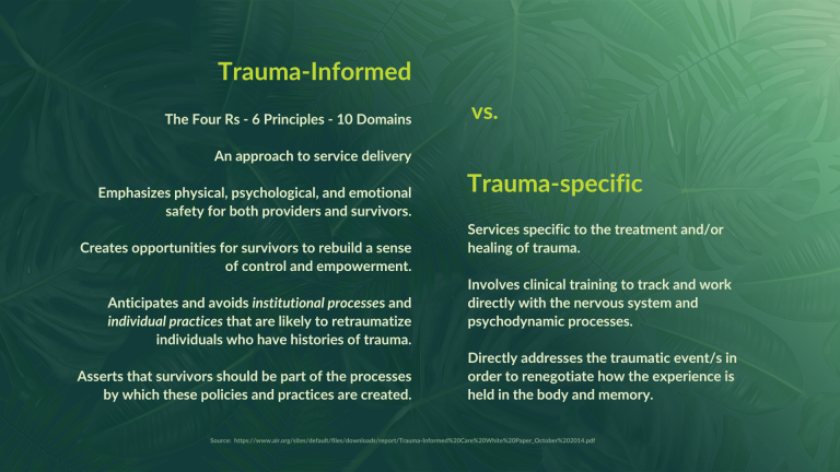 I see a lot of confusion around this distinction.  Trauma-informed is everything described in the section above and offers a framework for providing services without doing harm.  Some of those services may be trauma-specific.  You can absolutely be trauma-informed without being trauma-specific.  I offer this as an invitation to honor your scope of practice and expertise when providing services.